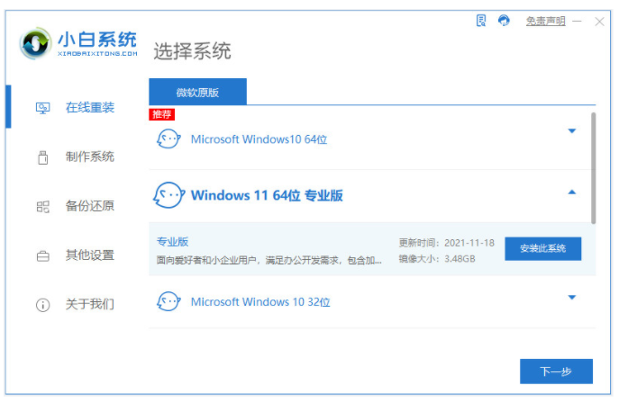 1、首先下载安装小白一键重装系统工具并点击打开,在线重装栏目选中win11系统,点击下一步。