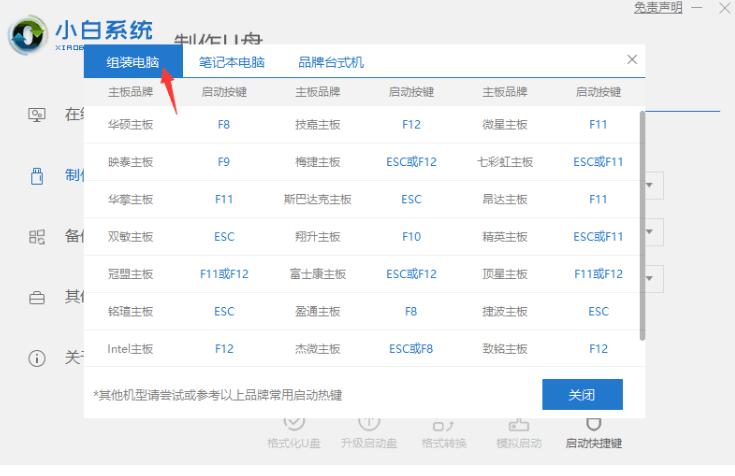 1、首先我们查看一下自己电脑的启动快捷键。在小白软件制作U盘界面,点击查看快捷键收藏,弹出界面。