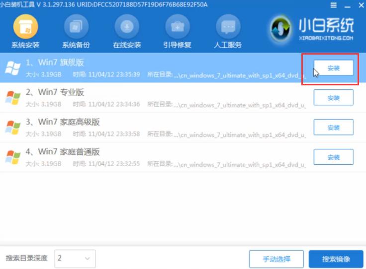 3、一般准备好的U盘启动盘会自动弹出PE系统中的小白安装大师工具。我们点击系统安装,在U盘中搜索镜像文件,选择win7旗舰版进行安装下载。