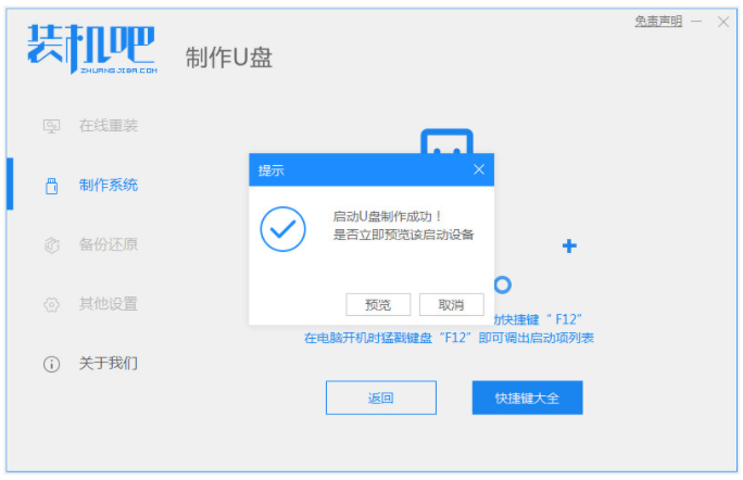 3、耐心等待软件制作u盘启动盘成功后,先预览需要安装的电脑主板的启动热键,然后再拔除u盘退出就可以了。