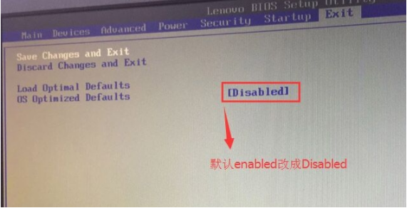 2.完成后点击上方的【exit】将【OS Optimized Defaults】修改为【disabled】,将其改为win7系统适用的模式。