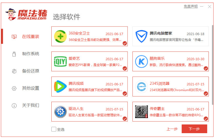 1.小米win7系统怎么重装呢?首先下载安装魔法猪一键重装软件,选择需要安装的系统,点击下一步。
