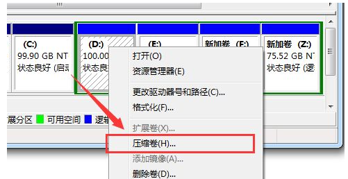 3、之后,右击选择分区,通过菜单选择“压缩卷”调整分区大小。
