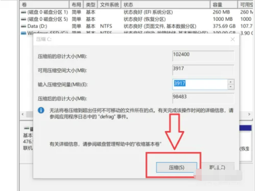 4、最后,选择需要压缩的空间,点击“压缩”即可进行压缩,完成“调整分区”。