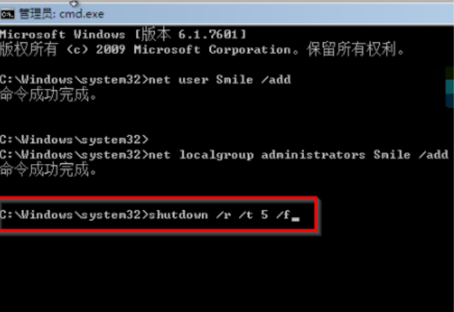 4、然后继续输入net localgroup administrators Smile /add 。