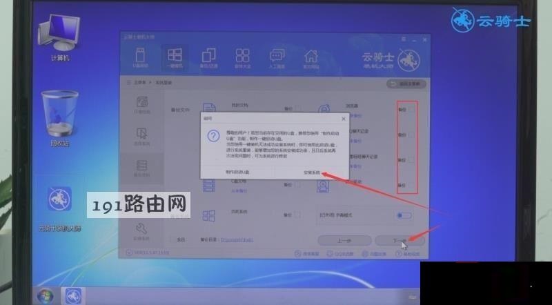第四步进入备份界面,点击下一步,弹出提示框,点击安装系统,系统会自动下载系统和备份资料