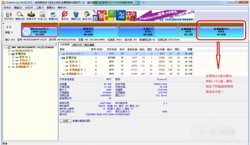 2、重新分配一个盘,用于xp的安装。大家可以从之前的系统盘分出一部分,也可以从最后一个盘(也就是离原始系统盘距离最远的那个盘)分配一部分出来(不会分配的朋友请自行搜索磁盘分区的方法)。需要用到DiskGenius分区软件。转换成主分区后别忘了点击左上角的保存按钮!然后重启电脑。