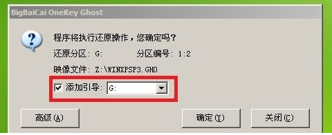 3、将下载好的xp系统镜像安装在刚刚分配的G盘上(这里用G表示,实例仅用G表示)。记住,勾选【增加引导】条目(非常重要哦!)然后,把磁盘换成您已经安装的盘,这是G盘,所以我选择G盘。另外,在ghost安装界面完成之后,计算机将不再从G盘引导下一步系统安装。