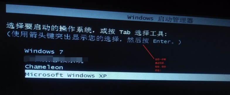 6、成功的话,系统重新启动后将显示xp系统,使用上下方向键选择xp,返回即可。