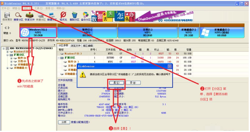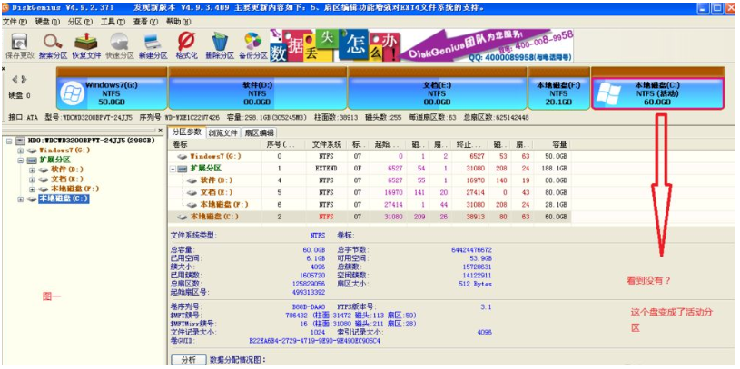 4、xp安装完成后,电脑已经自动地把xp所安装的盘切换成了活动分区,所以我们需要把活动分区切换回之前装win7的那个盘(因为easyBCD安装在win7系统中),这里我们又用到了DiskGenius分区软件。详情看图,然后重启电脑。