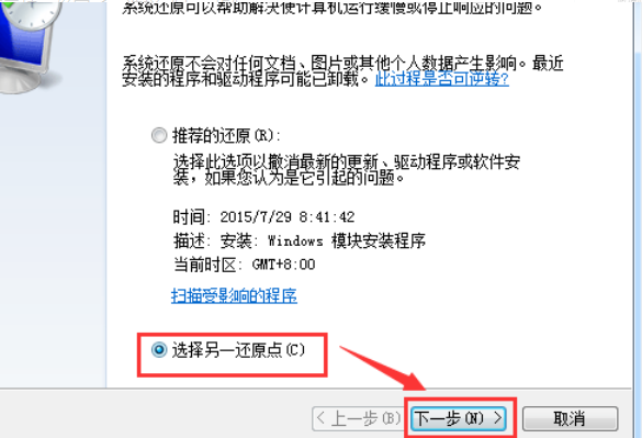 4、可以看到两个选择,一是系统推荐的还原点(就是系统自动恢复到正常前的状态),二是自己选择一个还原点。这里小编选择了第二种进入下一步。