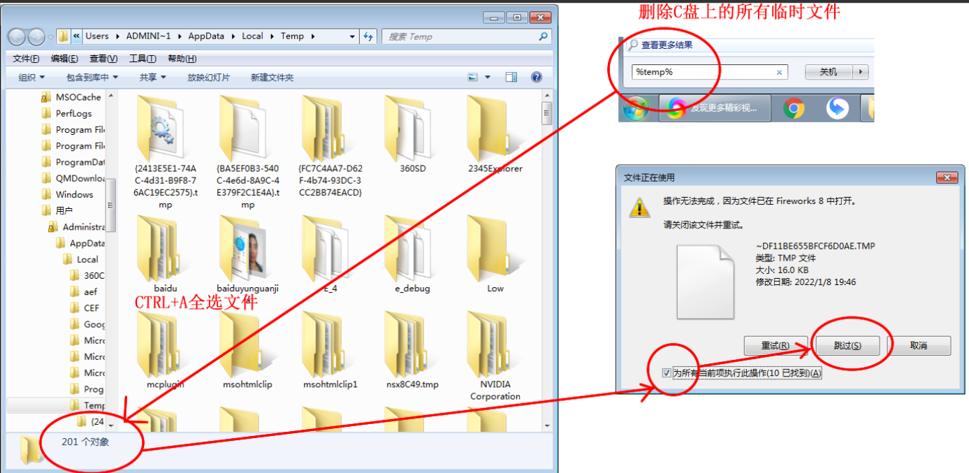 2、清除垃圾文件,%temp%运行命令打开垃圾文件夹,电脑使用一段时间都会产生大量的临时文件,只要删除就好了.删除这些临时文件是不会影响电脑安全的.可以通过ctrl+a全部选择,删除时遇到错误对框时,跳过就行了。