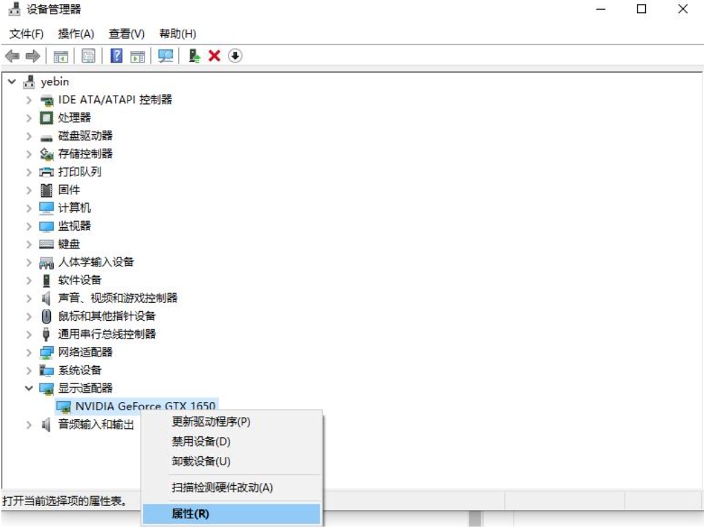 2、如果未安装显卡驱动就会出现黄色感叹号,右击显卡名称,选择属性。