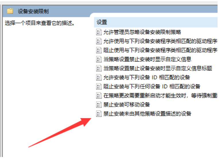 4、双击其中的"禁止安装未由其他策略设置描述的设备"设置。