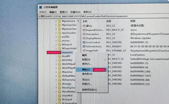 4、依次,找到。HKEY_LOCAL_MACHINE\SYSTEM\CurrentControlSet\Services\wuauserv,之后页面左侧选中wuauserv,右击鼠标,选择删除即可。