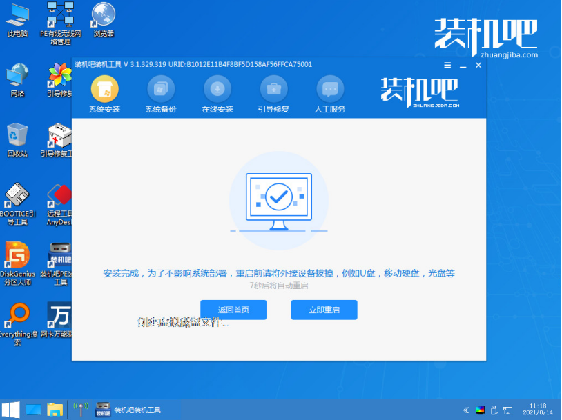 6、安装完成后,拔掉u盘重启电脑。