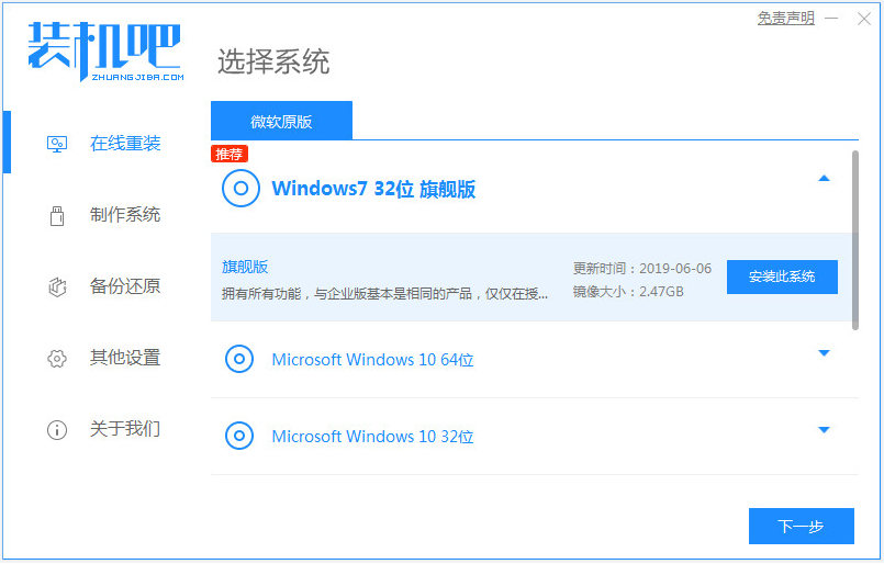 1、打开电脑下载安装好的装机吧一键重装系统软件,点击在线重装,选择需要安装的系统,进入下一步,如下图所示: