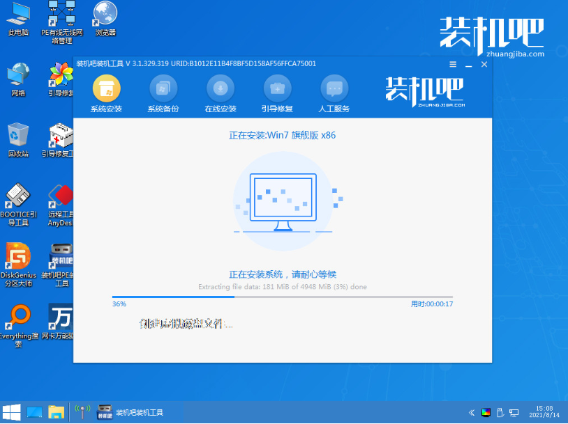 5、选择第一项装机吧pe系统回车进入,打开装机吧装机工具,选择需要的windows系统安装到系统盘c盘。