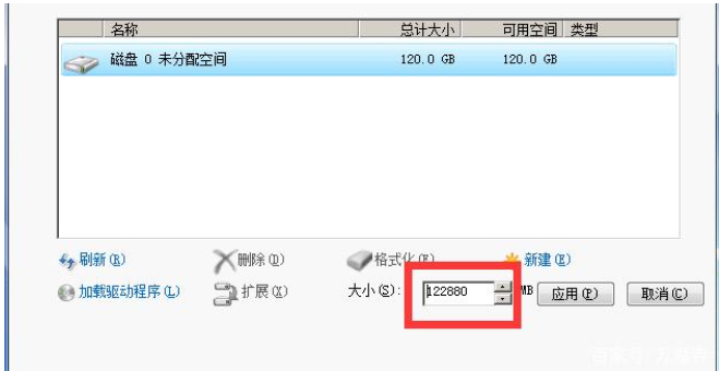 6、来到了分区界面,点击驱动器选项——新建。在大小后的框内输入想要分区的容量数值,点击应用。第一个主分区也就是我们的c盘,建议最少设置50G以上,这里的单位是MB,按照1G=1024MB的方法计算即可。