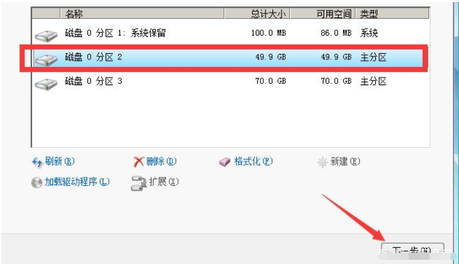 7、如果是已经分好区的硬盘,而且有重要数据的情况下,此处一定不要选择删除分区的选项,否则电脑内的数据不保。继续选择分区2,注意,系统保留分区下面的第一个分区是默认的c盘,系统是需要安装在这个分区下的,选择它,点击下一步。