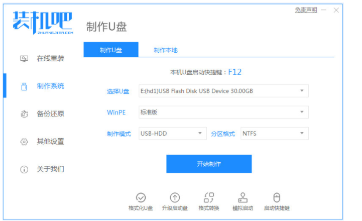 1、电脑下载装机吧一键重装系统软件。准备一个8GB以上的U盘。打开软件,选择制作系统,在制作U盘中选择您的U盘,其它参数默认直接开始制作即可。