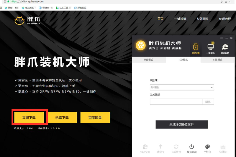 1.首先我们在网页中输入zj.xitongcheng.com,点击左侧"立即下载"安装胖爪装机大师软件到电脑上;
