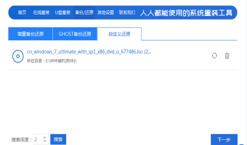 2、接着选择“自定义还原”,选择需要安装的win7精简版64位超小系统镜像,点击下一步。
