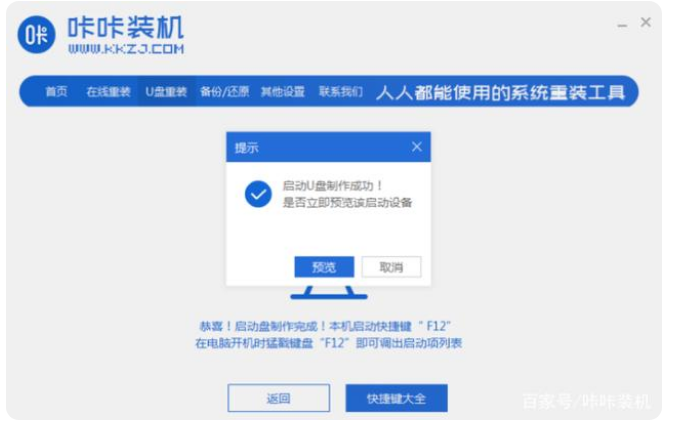 4.等待咔咔装机提示“u盘制作成功”之后,我们在点击“预览”。
