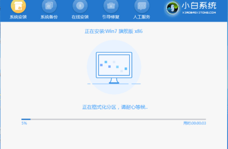 5、进入pe系统后,小白装机工具开始安装win7旗舰版系统,耐心等待即可。