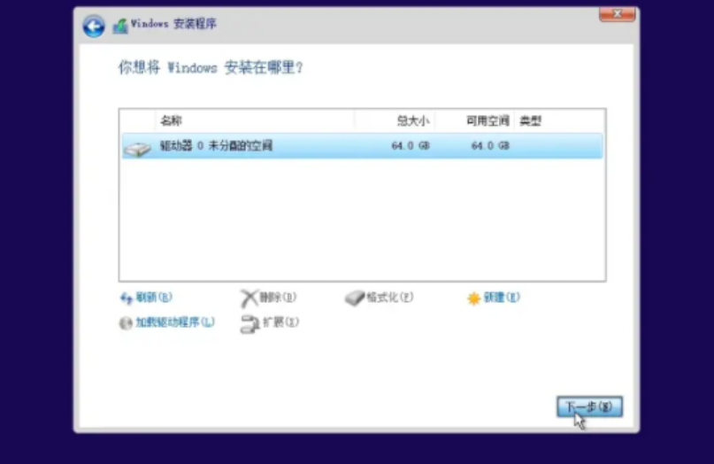 10、选择win10安装的位置,如果硬盘很大的话可以选择新建来直接进行分区,注意安装到c盘的话,建议至少预留50G以上的空间。