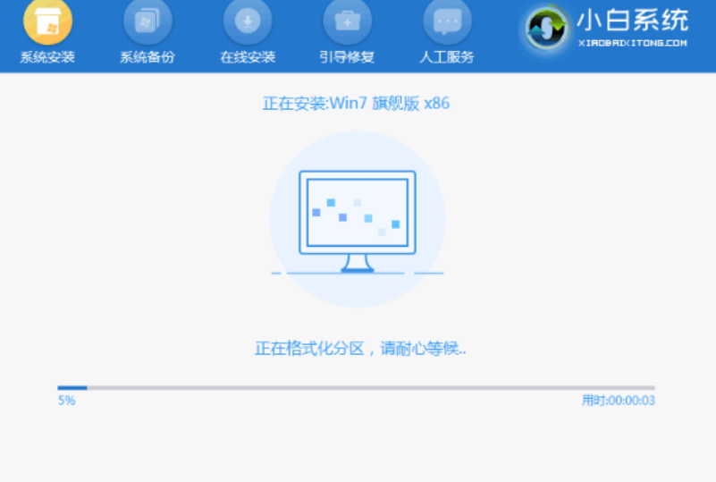 5、进入pe系统后,小白装机工具便开始自动安装win7旗舰版系统。