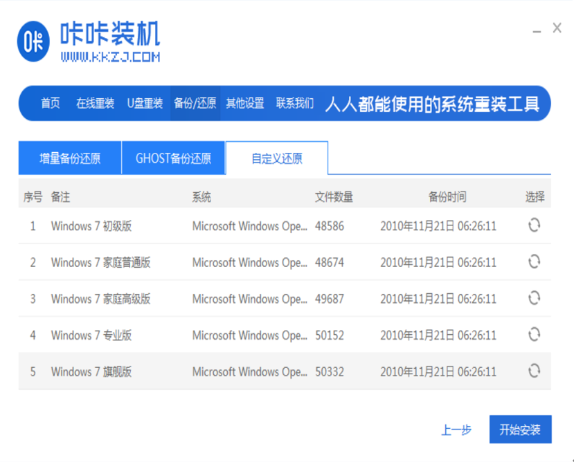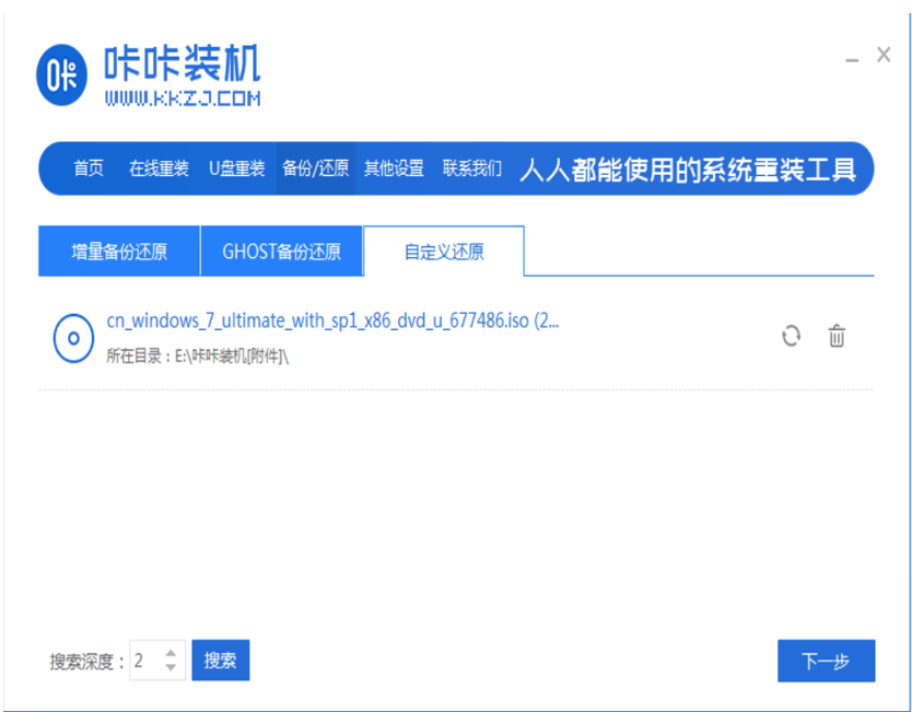 2、接着选择“自定义还原”,选择需要安装的win7精简版64位超小系统镜像,点击下一步。