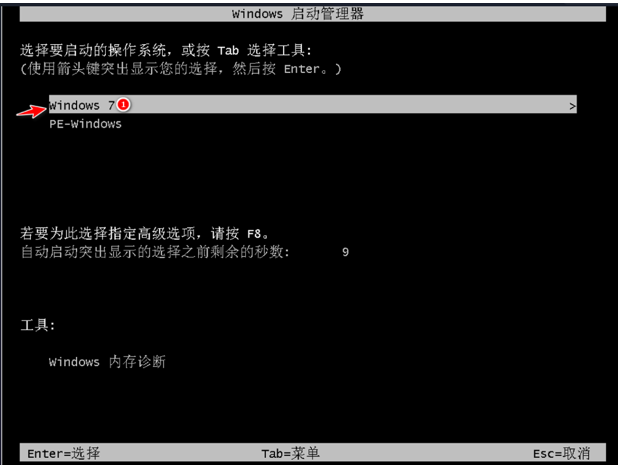 10、开机进入启动管理器,选择windows7,回车。