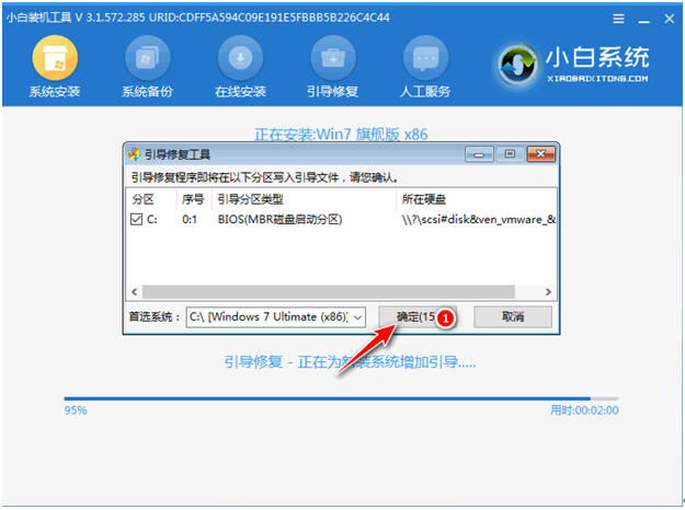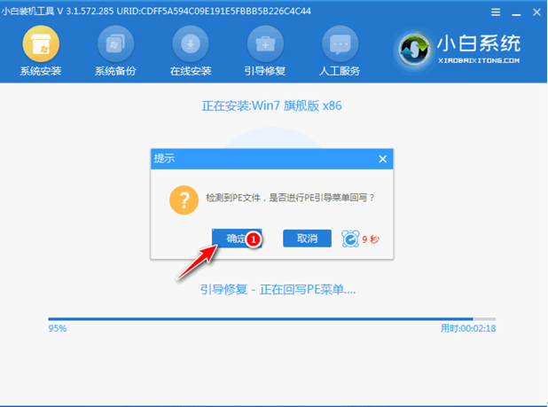 8、当系统检测到pe文件后,提示是否进行引导菜单会写,点击确定。