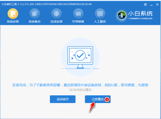 4、安装完成后,点击立即重启。(这里的软件会自动帮助我们重装系统)。