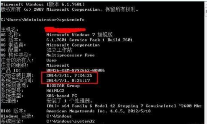 当按下回车键后就会弹出初始安装时间,小编的win7系统测试初始安装时间结果为2014年3月11日