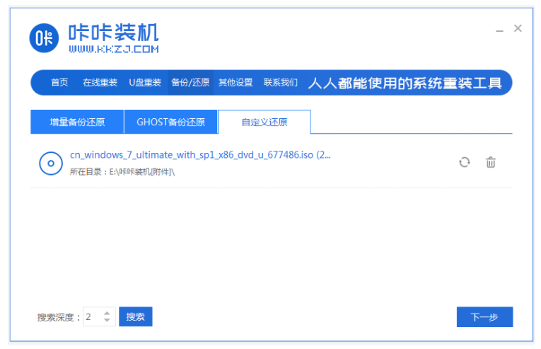 2、选择“自定义还原”选项,选择win7精简版系统镜像,进行下一步。