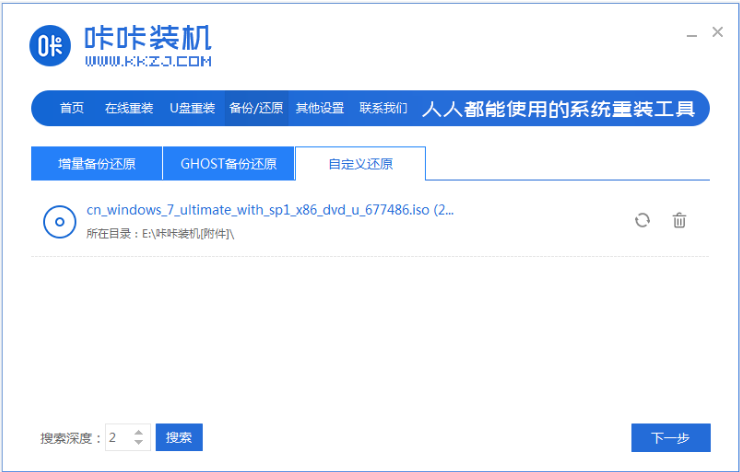 2、点击“自定义还原”,选择我们需要安装的win7专业版系统镜像,点击下一步。