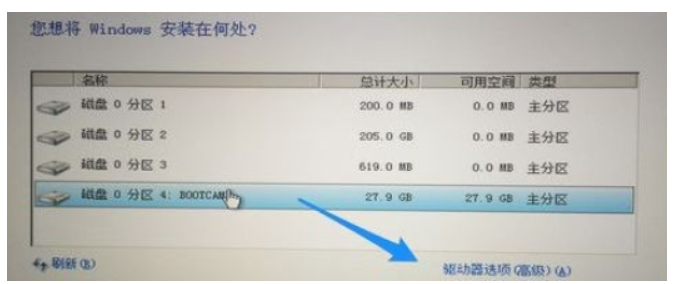 2,此时进入Windows分区界页面,在这里点击“驱动器选项(高级)”