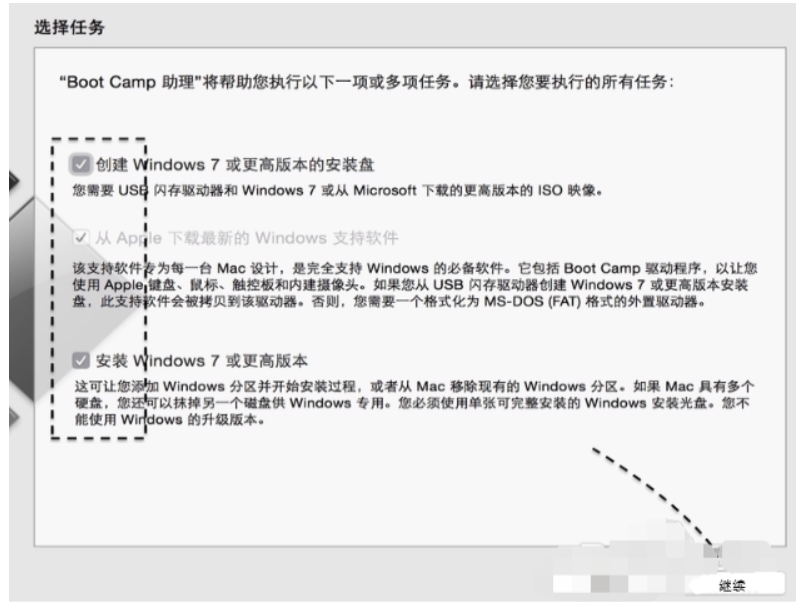 3,选中制作启动 U 盘的所有选项之后,点击“继续”。