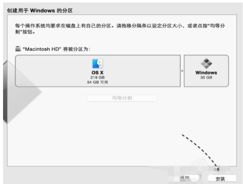 9,制作成功后,会自动进入磁盘分割页面,要为 Win7系统分多少磁盘空间。根据自己的情况来定,必须30G以上,移动中间的小圆点可以自行调整