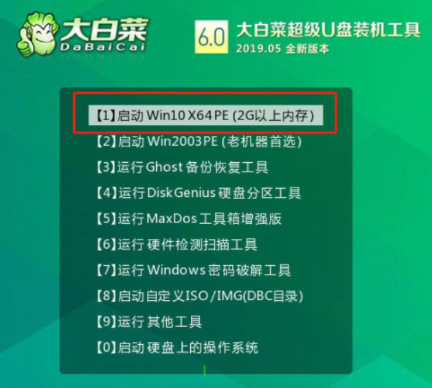 2.显示主菜单的时候,选择win10X64PE(超过2G的存储器),按回车进入winpe桌面。
