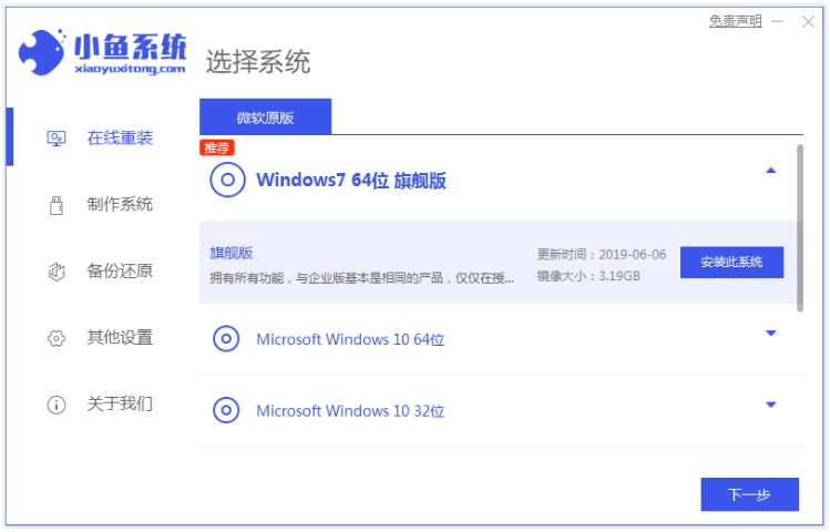 1、win7新手小白如何重装呢?先在电脑上下载安装小鱼一键重装系统工具并打开,关闭电脑的安全软件,备份系统重要的资料,选择我们需要安装的win7系统,点击安装此系统,点击下一步。