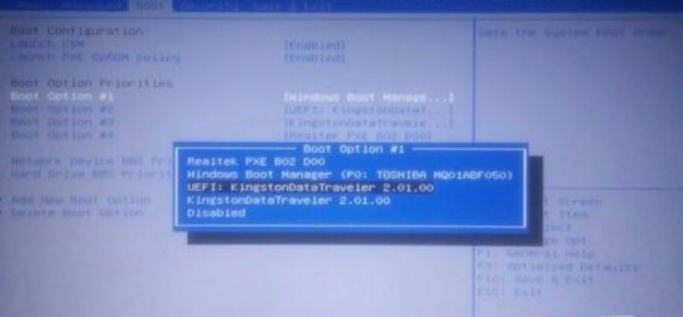 2、通过键盘上的“右(→)方向键”选择“Boot”,然后“下(↓)方向键”选择“Boot Option #1”,然后按“enter键”,再按“上(↑)下(↓)键”选择“第三项”或“第四项”即U盘,按“enter键”,然后按“f10键”,电脑保存并重启。