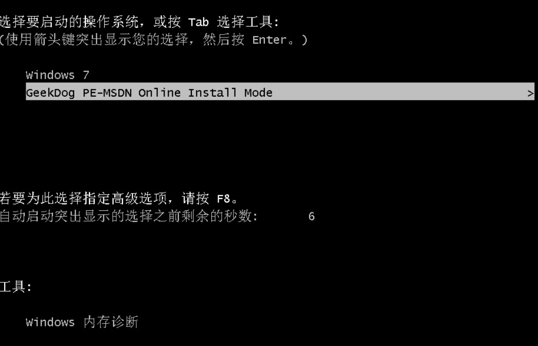 5、下载完成后重启电脑,进入启动页面时,选择“GeekDog..”项,回车进入pe系统。