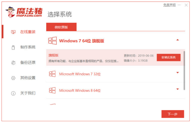 1、先在电脑上下载安装并点击打开魔法猪,选择在线重装系统,选择需要重装的win7系统,点击安装此系统。