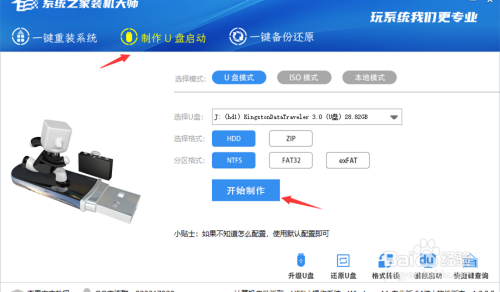 2、点击上方制作U盘启动,进入界面后,保持默认格式直接点击开始制作。
