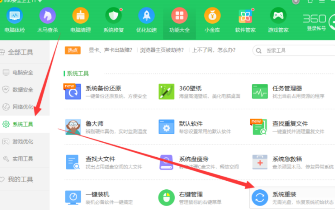1、 在win7系统中,下载360重装系统大师,或者运行360安全卫士,在所有工具中添加【系统重装】;