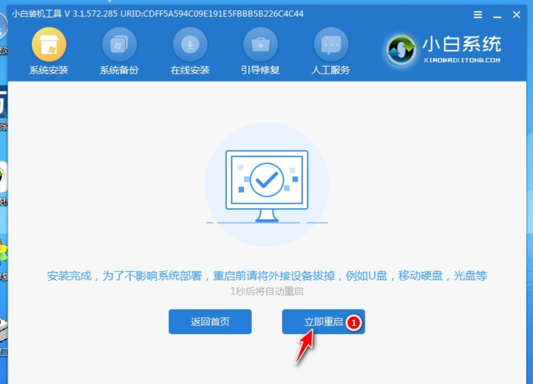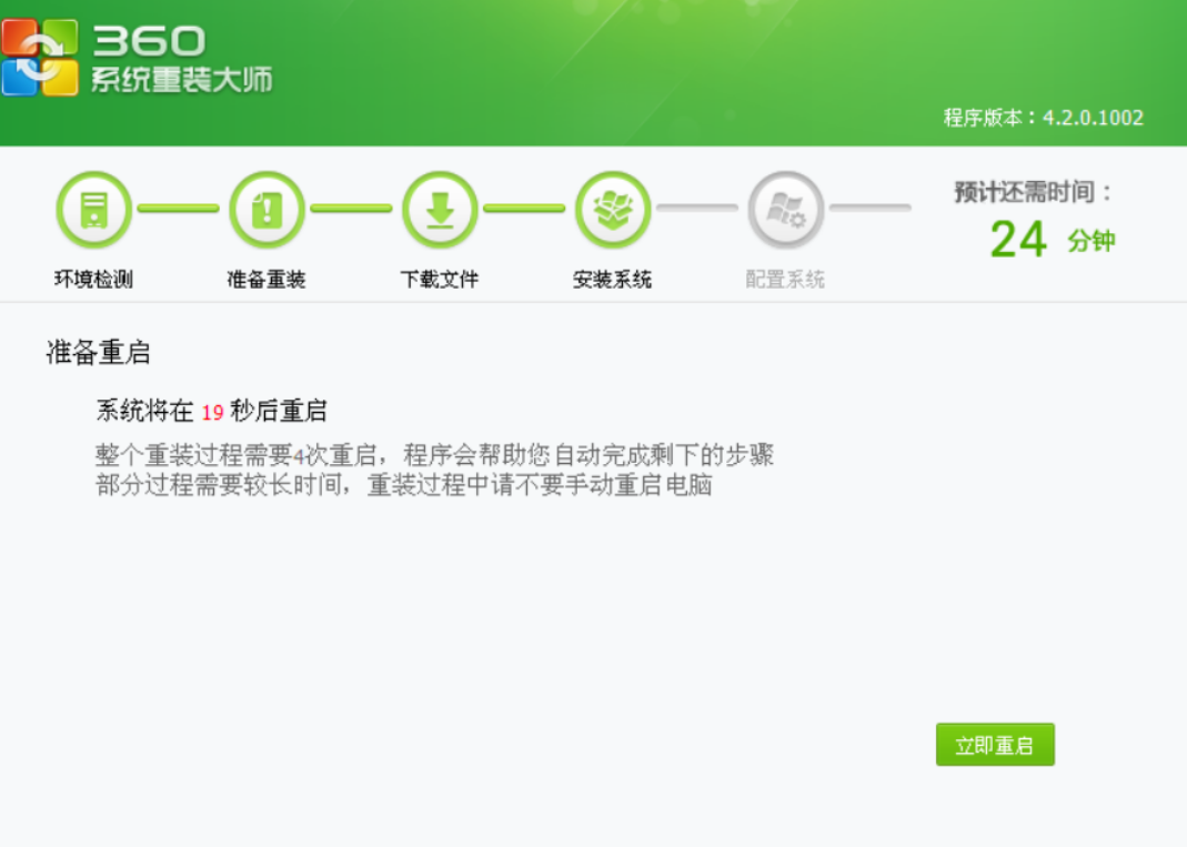 5、下载完成后,点击【立即重启】,如果不点击,重 装工具将会在一段时间之后自动执行重启;