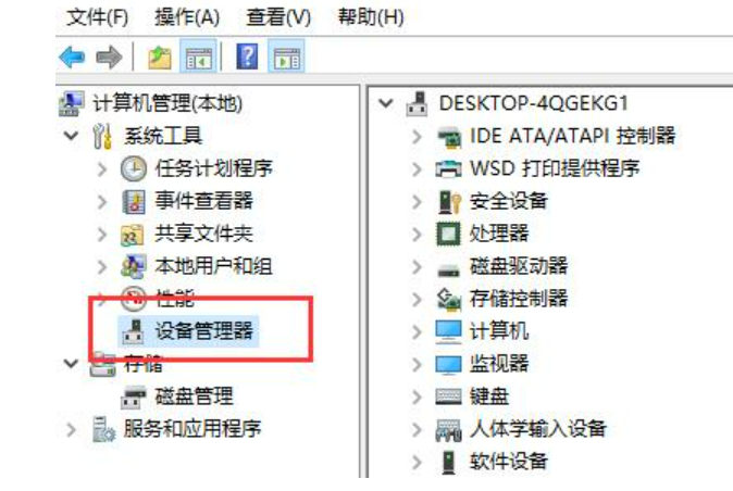 2、找到计算机管理下方的“设备管理器”,点击进入。